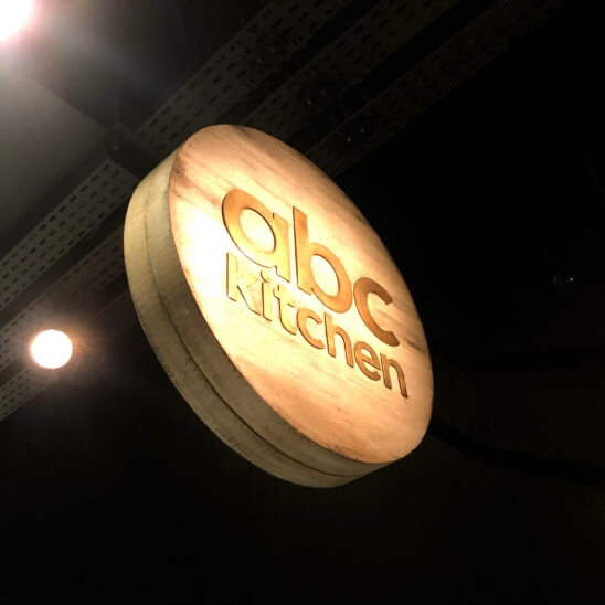 Для изготовления используются композитные панели с прорезями под инкрустацию из оргстекла. Имеет двустороннюю подсветку.