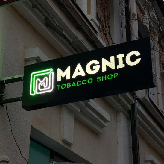 Изготавливается из специального профиля (борта) и лицевой части. Профиль может быть алюминиевым или пластиковым. Имеет двустороннюю подсветку. Привлекает внимание посетителей и придает зданию свежий вид.