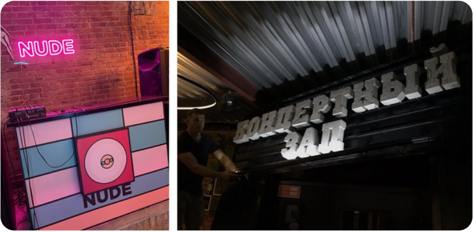 Конечно, первое что должна делать вывеска — это привлекать к себе внимание и приглашать посетить клуб. Но не менее важно, чтобы вывеска была продолжением атмосферы, царящей внутри клуба.